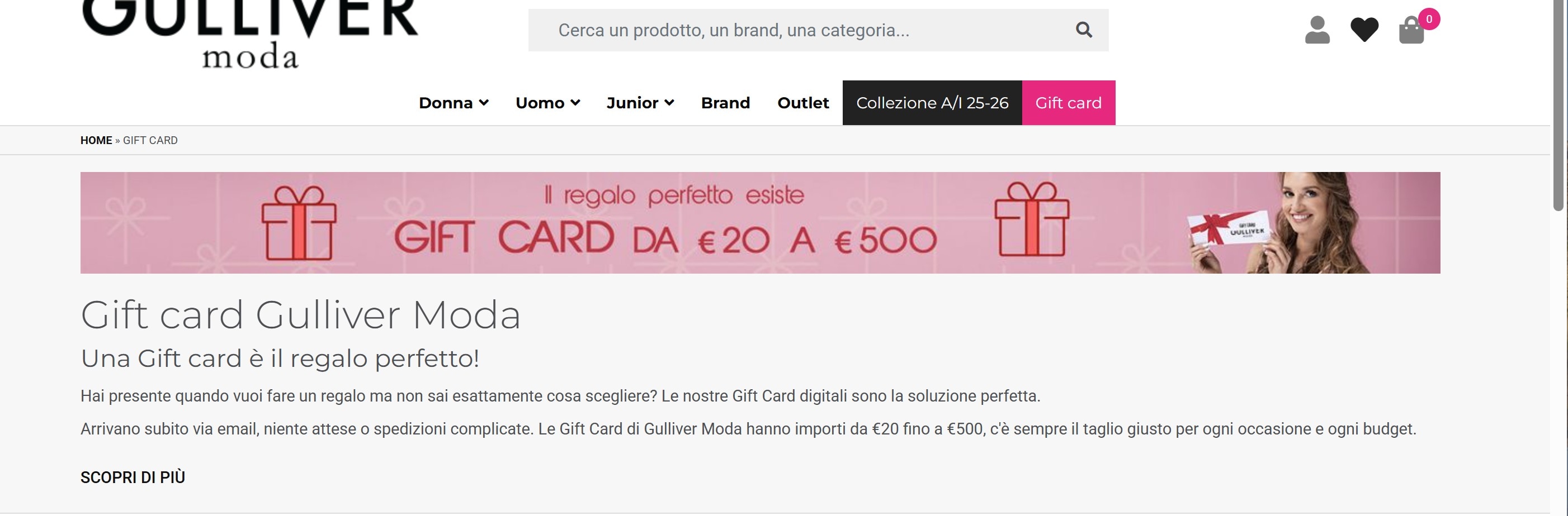 Vieni a conoscere Gulliver Moda, nei suoi tre punti vendita di Colleferro, Ciampino e Ceccano troverai le migliori marche di abbigliamento moda e calzature e pelletteria Ti offriamo un’esperienza di acquisto unica perché i nostri negozi sono realizzati come dei veri store di concezione americana: abbiamo curato l’allestimento funzionale degli spazi interni con ampie superfici di vendita e tutti gli articoli in vendita sono esposti e divisi per settori merceologici, l’ingresso è libero ed all’esterno il comodo parcheggio rende ancora più semplice e piacevole la tua visita. Da noi troverai oltre 100 marchi tra i più importanti e conosciuti della moda con vasto assortimento di calzature, pelletteria, abbigliamento e valigeria per uomo, donna e bambino Da piccola bottega artigiana nel 1935 siamo cresciuti fino a diventare un’importante realtà nel settore calzature e abbigliamento ma siamo rimasti comunque attenti nel tempo a proporre articoli scelti con la professionalità e la passione di artigiani della moda che continuano a lavorare per garantire qualità e servizio ai nostri clienti.
