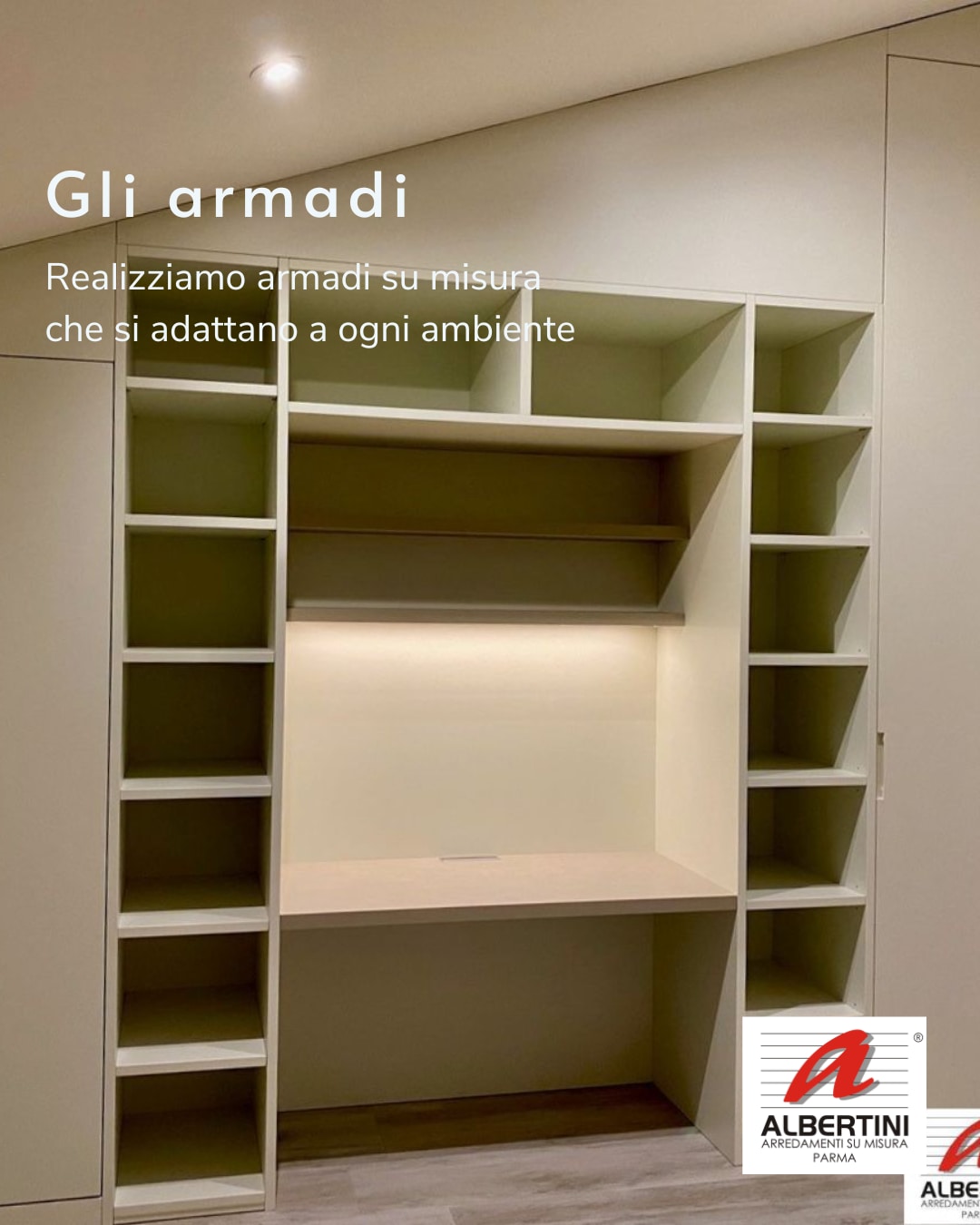 Albertini Arredamenti Su Misura è un'azienda di Parma specializzata nella progettazione e produzione di arredamenti per interni. Propone un'ampia gamma di mobili su misura eseguiti nel proprio laboratorio interno per soddisfare ogni esigenza del cliente e con particolare attenzione alle dimensioni e caratteristiche dell'ambiente. Albertini Arredamenti Su Misura realizza in particolare armadi, librerie, cucine, arredo bagno, camere da letto, armadi guardaroba per mansarde e mobili da inserire in ambienti dalle misure ridotte o particolari nonché armadi per sottoscala, armadi per sottotetto, cucine componibili, su misura e su disegno e molto altro ancora. L'azienda è aperta dalle 8:00 alle 12:00 e dalle 14:00 alle 18:00 dal lunedì al venerdì.